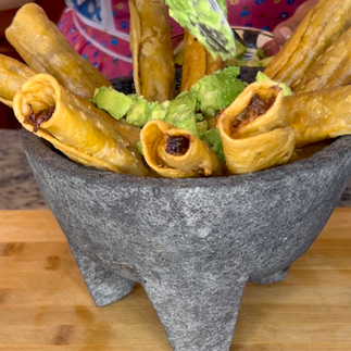 10-Ensamblar las flautas en un molcajete o plato. Primero agregar la salsa, colocar las flautas alrededor del molcajete. Si las vas a servir en un plato, primero coloca las flautas y luego vierte la salsa sobre ellas. Cubrir con aguacate, pico de gallo, queso y crema agria. ¡Ahora a disfrutar!